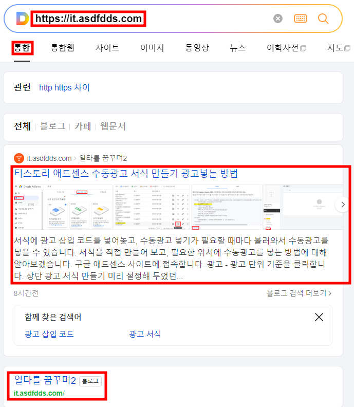 보안 접속 인증서 발급이 완료되기 전에는 해당 사이트(https://it.asdfdds)를 다음에서 검색했을 때, 페이지 내용과 블로그가 검색은 되더라도 클릭하면 실제로 접근할 수 없습니다. 따라서 보안 접속 인증이 완료될때까지 기다려야합니다.